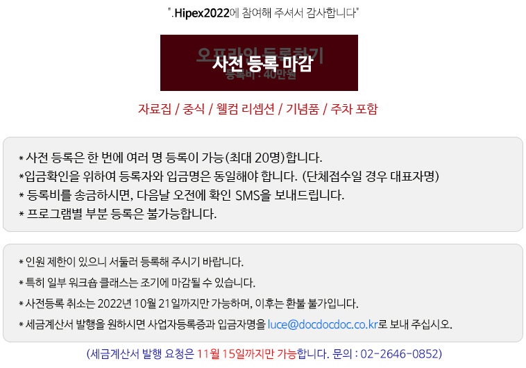 이름 영문이름(수료증 표기용) 소속 (기관) 직책 (자세히) E-Mail 연락처 (핸드폰) Workshop 1 선택Class 선택 ( 필 수 )Class1 - 우리, 삐딱하게 선을 넘자! part 1Class2 - [Hospital 4.0] 지속 가능한 병원 : 디지털 트랜스포메이션 & ESG, part 1Class3 - Why? Why? Why? 질문을 통해 답을 찾는 환자중심 서비스디자인Class4 - 간담회 - 이왕준 이사장에게 묻는다 Workshop 2 선택 Class 선택 ( 필 수 ) Class1 - 우리, 삐딱하게 선을 넘자! part 2Class2 - [Hospital 4.0] 지속 가능한 병원 : 디지털 트랜스포메이션 & ESG part 2Class3 - 일상을 여행처럼, 인생은 관광객 모드로 * 추가 인원을 등록하실 경우 확인을 위해,제일 첫번째 등록인 이름과 무통장입금 시 [보내시는 분] 이름을 동일하게 기입해주세요. * 인원에 해당하는 총 등록비를 입금하시면, 익일 오전 확인 문자를 드립니다. * 등록비 확인과 행사 당일 확인 절차를 위해 정확한 정보기입 부탁드립니다.